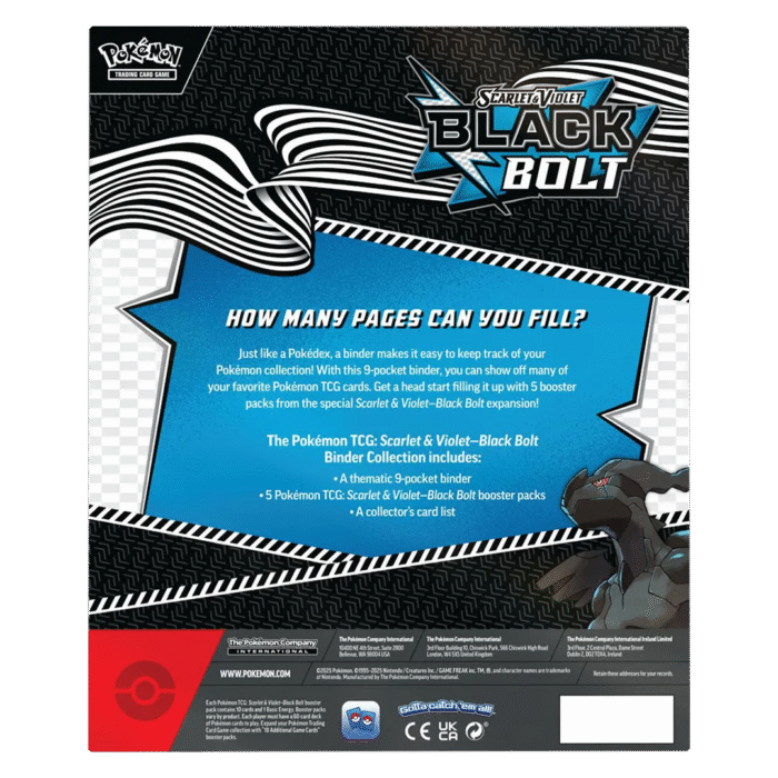 Just like a Pokédex, a binder makes it easy to keep track of your Pokémon collection! With this 9-pocket binder, you can show off many of your favorite Pokémon TCG cards. Get a head start filling it up with 5 booster packs from the special Scarlet & Violet—Black Bolt expansion!