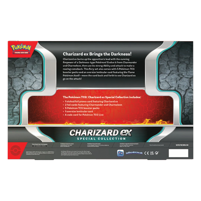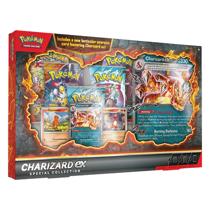Charizard ex burns up the opposition’s lead with the cunning firepower of a Darkness-type Pokémon! Evolve it from Charmander and Charmeleon, then use its strong Ability and attack to make a roaring comeback. This fiery set also comes with 5 Pokémon TCG booster packs and an oversize lenticular card featuring the Flame Pokémon itself—move the card back and forth to see Charizard ex go on the attack!Â
