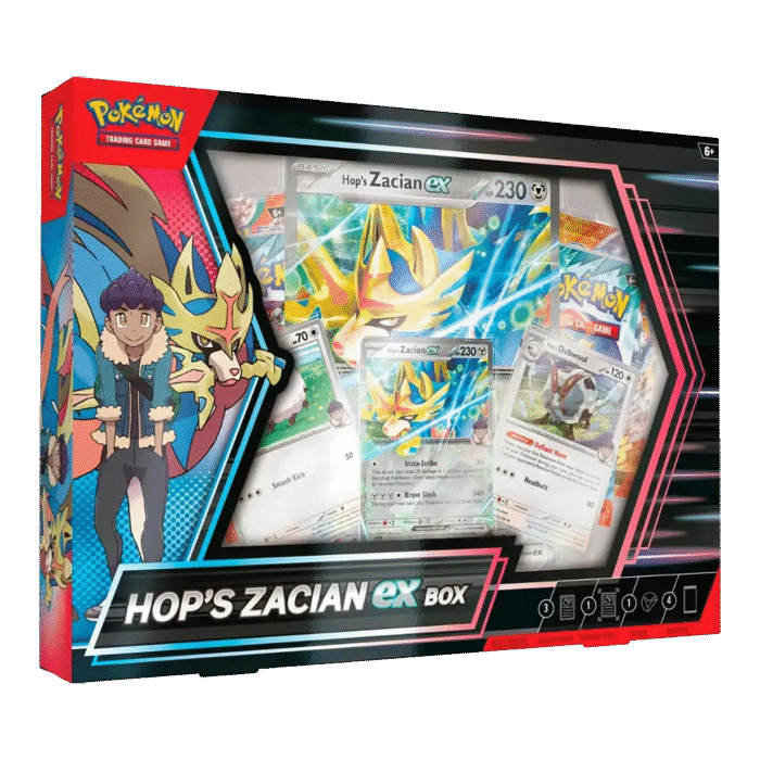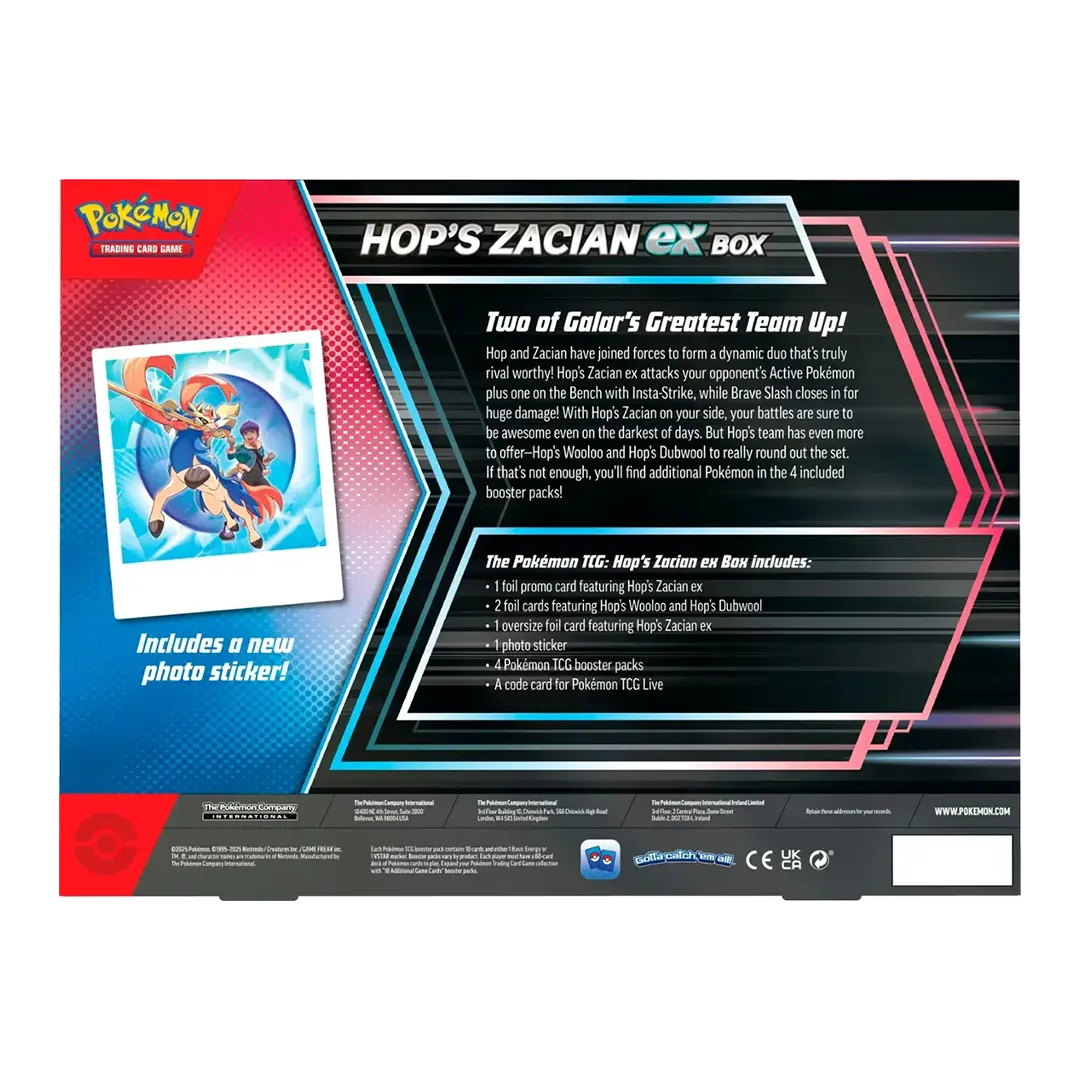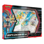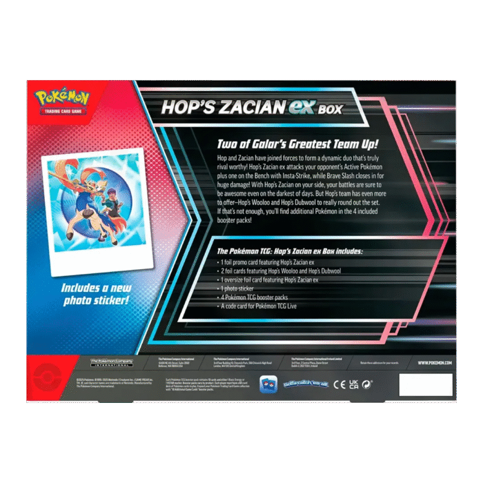 Hop and Zacian have joined forces to form a dynamic duo that’s truly rival worthy! Hop’s Zacian ex attacks your opponent’s Active Pokemon plus one on the Bench with Insta-Strike, while Brave Slash closes in for huge damage! With Hop’s Zacian on your side, your battles are sure to be awesome even on the darkest of days. But Hop’s team has even more to offer- Hop’s Wooloo and Hop’s Dubwool to really round out the set. If that’s not enough, you’ll find additional Pokemon in the 4 included booster packs! The Pokemon TCG: Hop’s Zacian ex Box includes: 1 foil promo card featuring Hop’s Zacian ex, 2 foil cards featuring Hop’s Wooloo and Hop’s Dubwool, 1 oversize foil card featuring Hop’s Zacian ex, 1 photo sticker, 4 Pokemon TCG booster packs and A code card for Pokemon TCG Live.