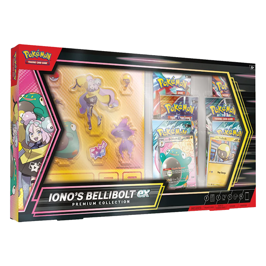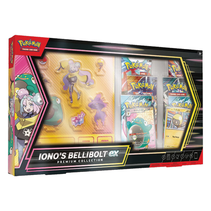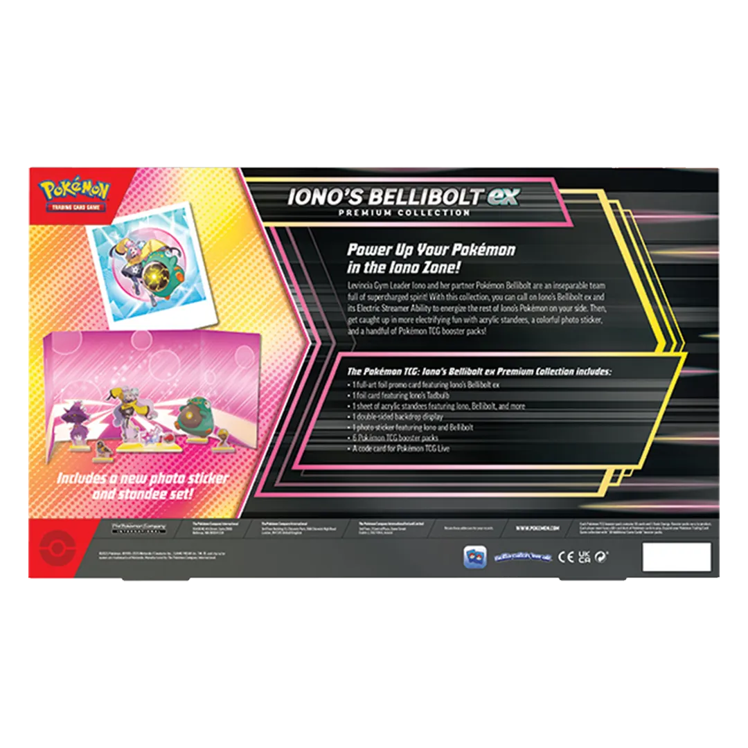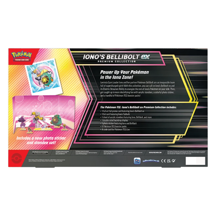 Levincia Gym Leader Iono and her partner Pokémon Bellibolt are an inseparable team full of supercharged spirit! With this collection, you can call on Iono’s Bellibolt ex and its Electric Streamer Ability to energize the rest of Iono’s Pokémon on your side. Then, get caught up in more electrifying fun with acrylic standees, a colorful photo sticker, and a handful of Pokémon TCG booster packs!