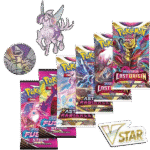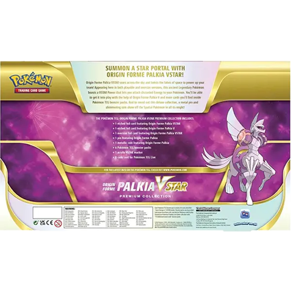 • 1 etched foil card featuring Origin Forme Palkia VSTAR• 1 etched foil card featuring Origin Forme Palkia V• 1 oversize foil card featuring Origin Forme Palkia VSTAR• 1 pin featuring Origin Forme Palkia• 1 metallic coin featuring Origin Forme Palkia• 6 Pokémon TCG booster packs• 1 acrylic VSTAR marker• A code card for Pokémon TCG Live