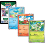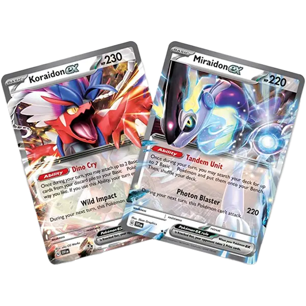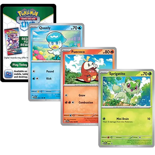 • 3 foil promo cards featuring Sprigatito, Fuecoco, and Quaxly• 1 foil oversize card featuring Koraidon ex or Miraidon ex• 1 collector’s pin featuring Sprigatito, Fuecoco, or Quaxly• 4 Pokémon TCG booster packs• 1 code card for Pokémon TCG Live