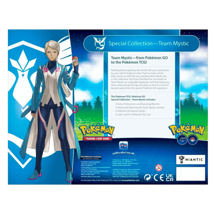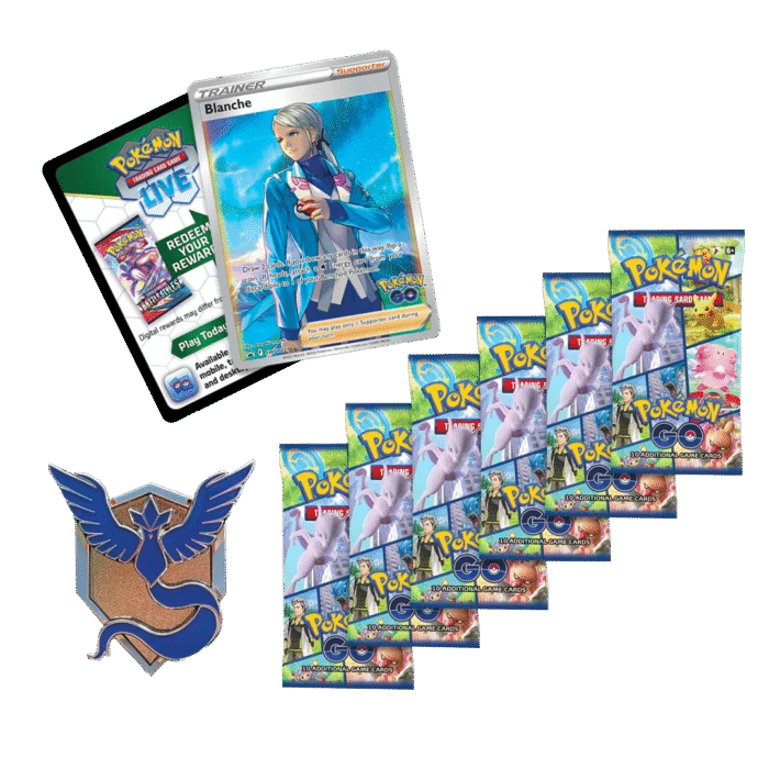 • A full-art foil promo card featuring Spark, Blanche, or Candela• A deluxe pin featuring the emblem of Team Instinct, Team Mystic, or Team Valor• 6 Pokémon GO booster packs• A code card for Pokémon TCG Live