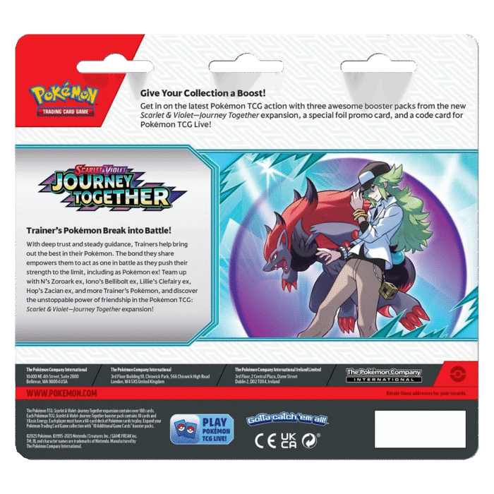 With deep trust and steady guidance, Trainers help bring out the best in their Pokémon. The bond they share empowers them to act as one in battle as they push their strength to the limit, including as Pokémon ex! Team up with N’s Zoroark ex, Iono’s Bellibolt ex, Lillie’s Clefairy ex, Hop’s Zacian ex, and more Trainer’s Pokémon, and discover the unstoppable power of friendship in the Pokémon TCG: Scarlet & Violet—Journey Together expansion!
