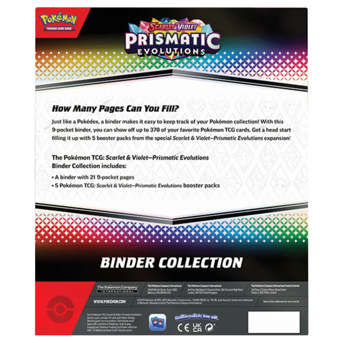 Just like a Pokédex, a binder makes it easy to keep track of your Pokémon collection! With this 9-pocket binder, you can show off up to 378 of your favorite Pokémon TCG cards. Get a head start filling it up with 5 booster packs from the special Scarlet & Violet—Prismatic Evolutions expansion!