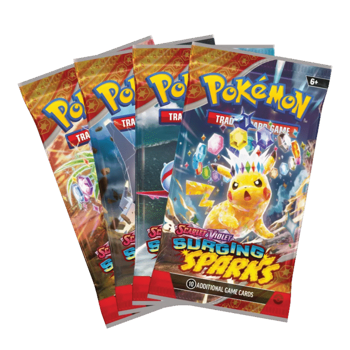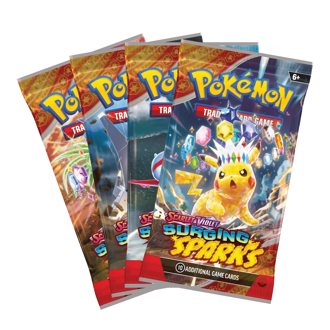 Terawatts of electricity crash down from the sky in a tropical paradise, setting the stage for the supercharged Pikachu ex! With the power of a Stellar Tera Pokemon ex, it lights up the shoreline, revealing a parade of dragon Pokemon led by the towering Alolan Exeggutor ex! Archaludon ex and Latias ex round out the horde, while new ACE SPEC cards and more new Pokemon ex bring surprises of their own. Currents crackle and dragons roar in the Pokemon TCG: Scarlet & Violet- Surging Sparks expansion! Over 250 cards. More than a dozen new Pokemon ex. More new ACE SPEC cards. More than 20 Trainer cards. More than 50 Pokemon and Trainer cards with special illustrations.