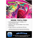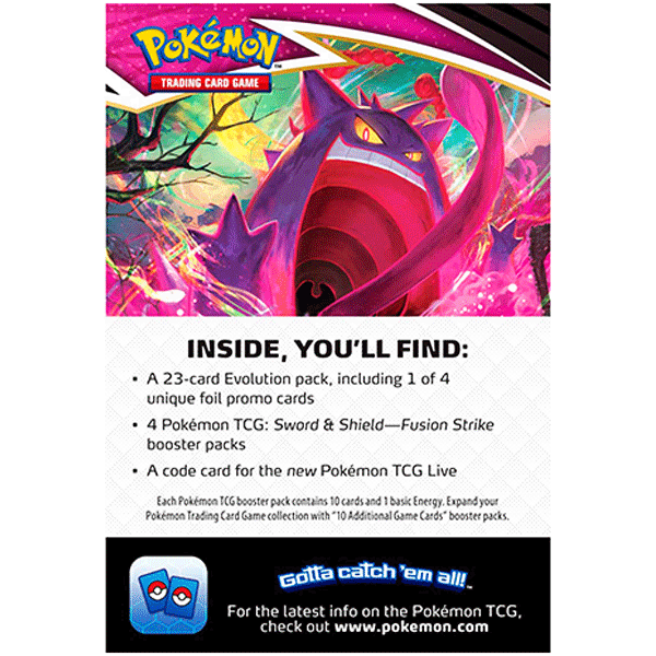 • A 23-card Evolution pack, including 1 of 4 unique foil promo cards• 4 Sword & Shield—Fusion Strike booster packs, each containing 10 cards and 1 basic Energy• A code card for the Pokémon Trading Card Game Online