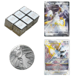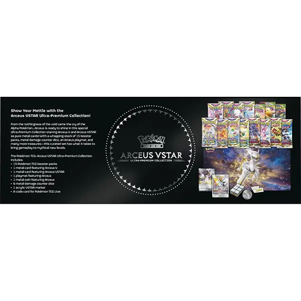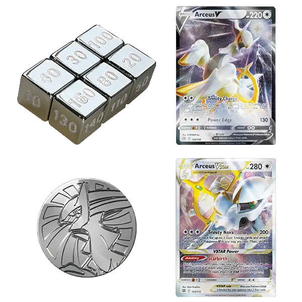 • 15 Pokémon TCG booster packs• 1 metal card featuring Arceus V• 1 metal card featuring Arceus VSTAR• 1 playmat featuring Arceus• 1 metal coin featuring Arceus• 6 metal damage counter dice• 1 acrylic VSTAR marker• A code card for Pokémon TCG Live