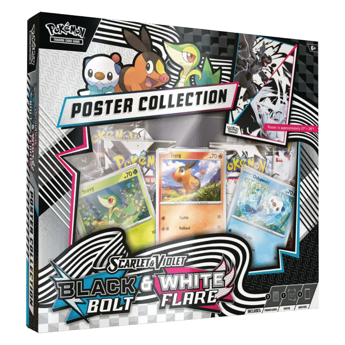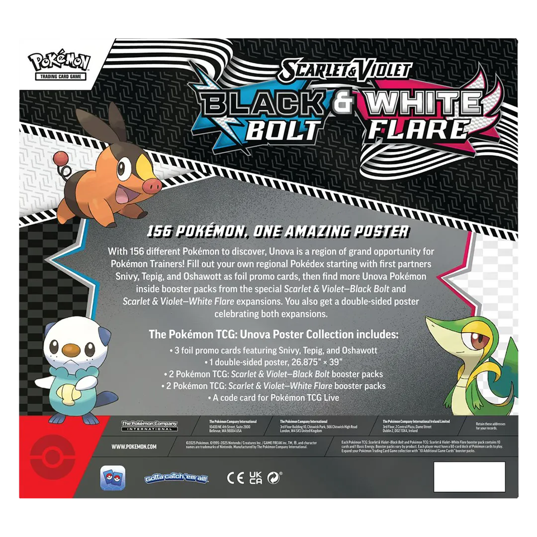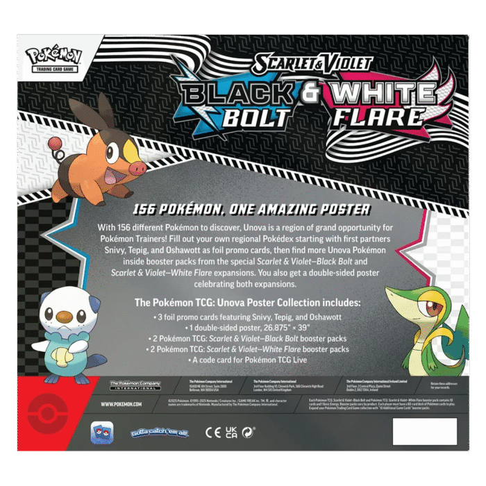 With 156 different Pokémon to discover, Unova is a region of grand opportunity for Pokémon Trainers! Fill out your own regional Pokédex starting with first partners Snivy, Tepig, and Oshawott as foil promo cards, then find more Unova Pokémon inside booster packs from the special Scarlet & Violet—Black Bolt and Scarlet & Violet—White Flare expansions. You also get a double-sided poster celebrating both expansions.